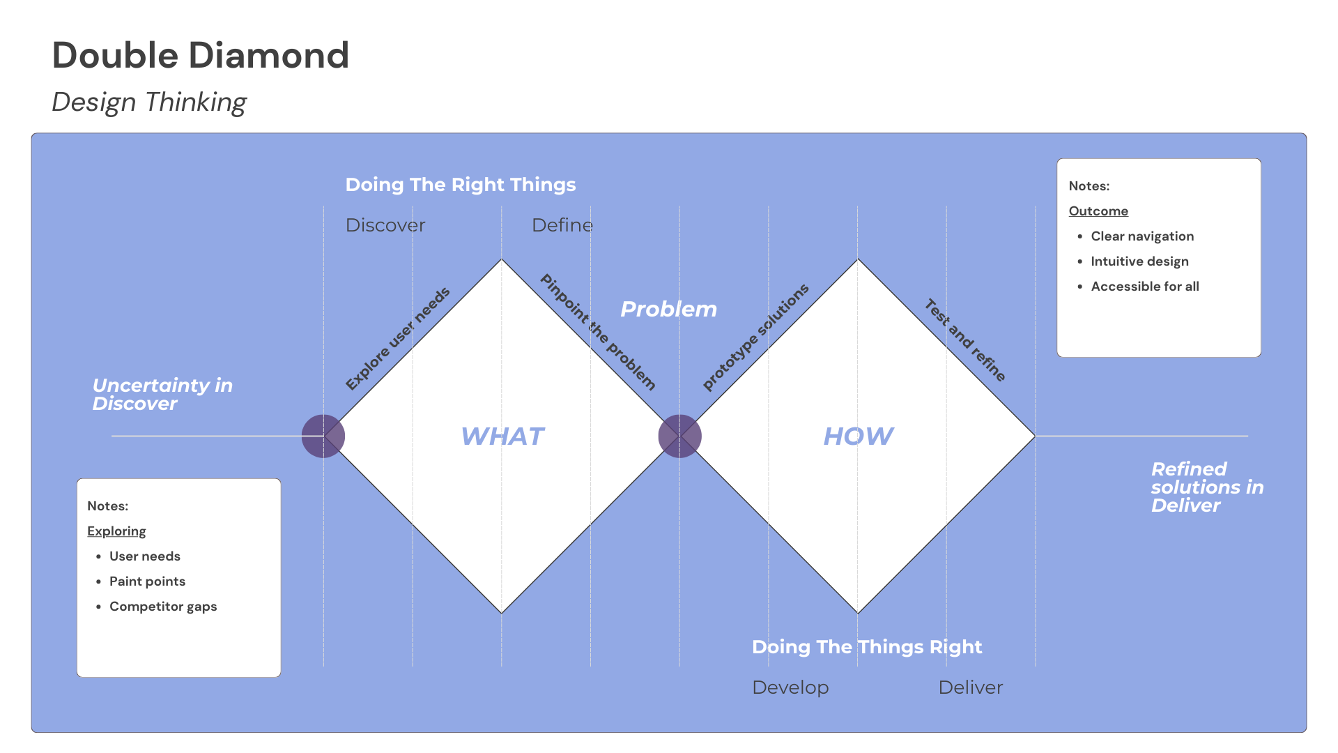 To guide this project, I used the Double Diamond design process. I like this framework because it balances creativity with structure, helping me stay open to possibilities at the start and then narrowing down to practical solutions that truly work.