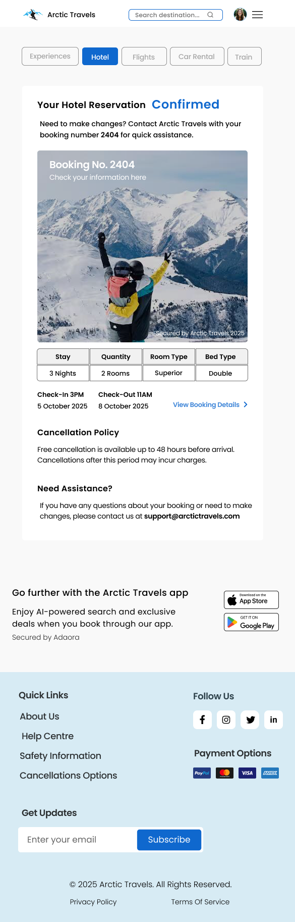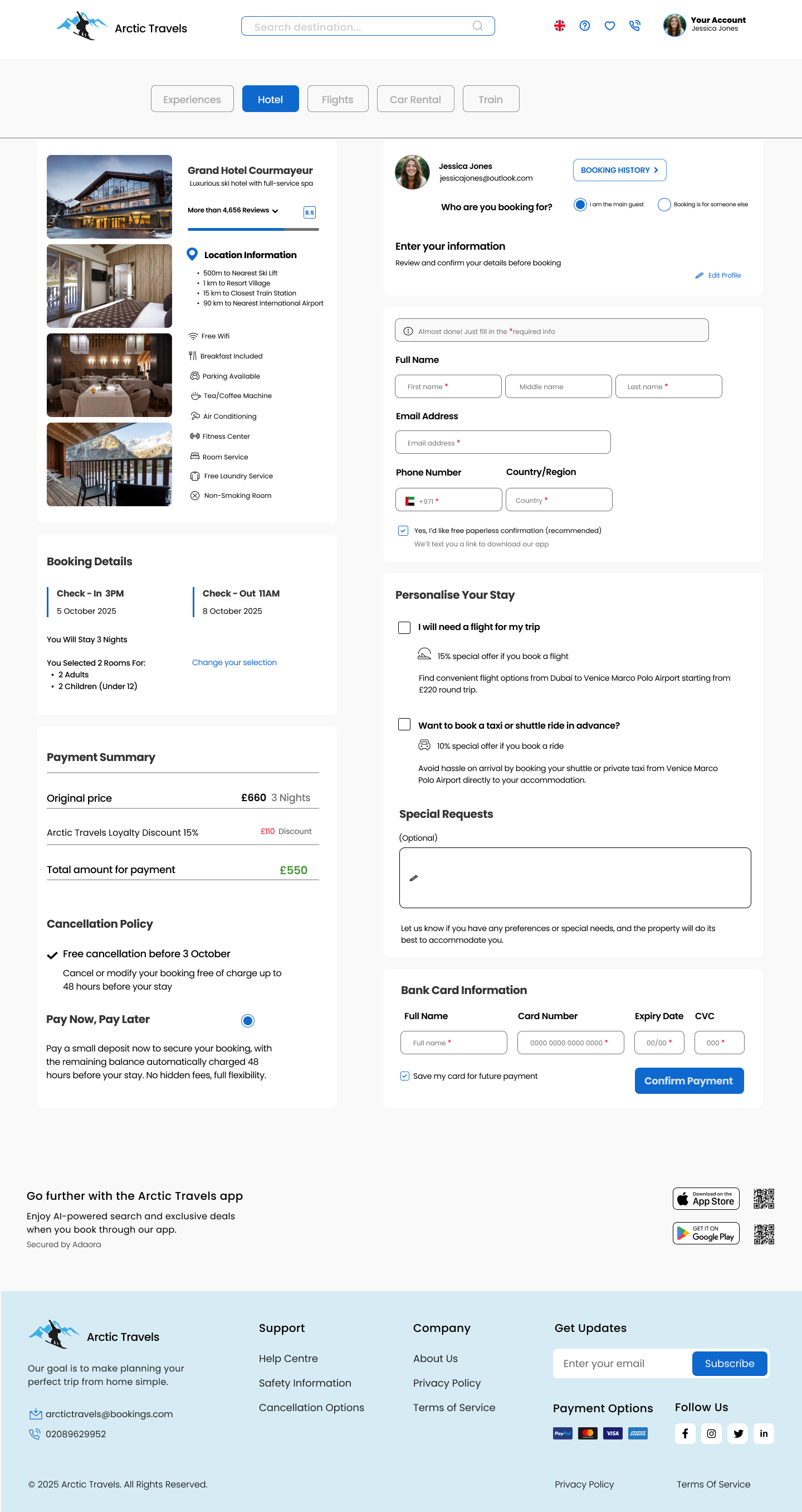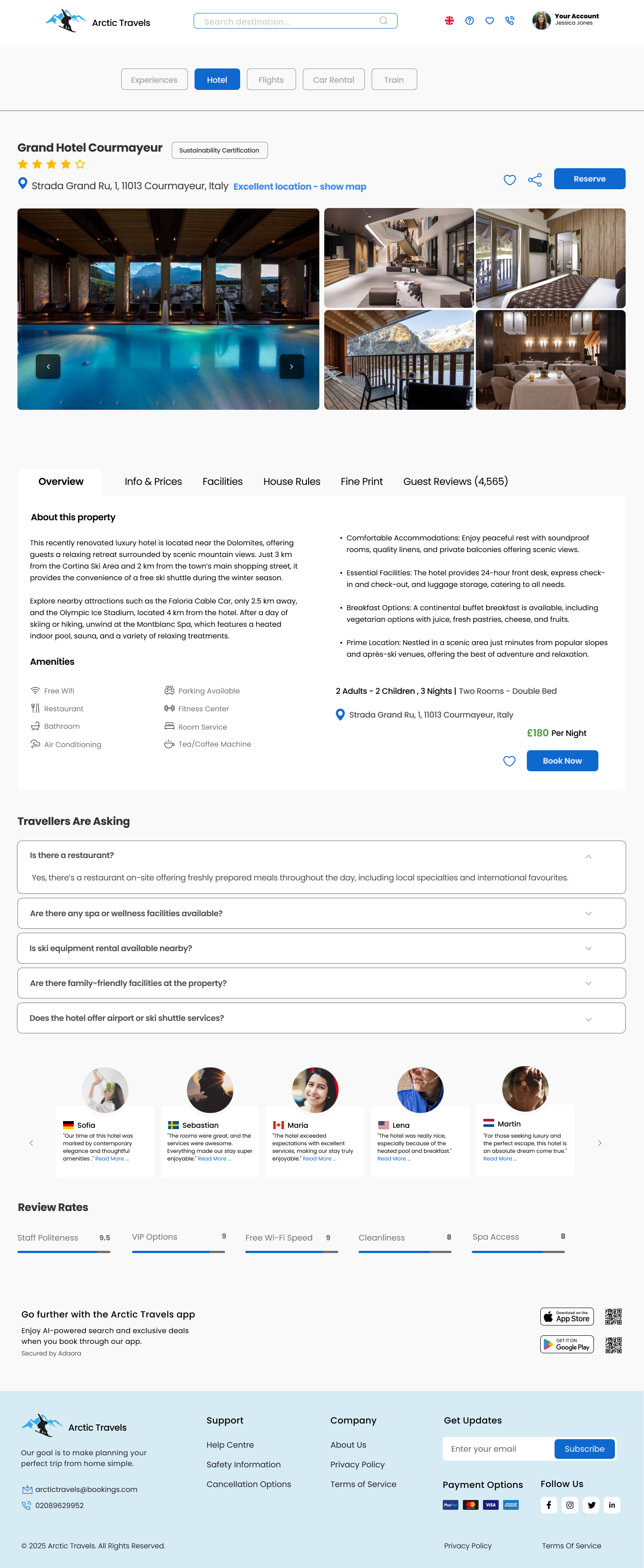 The design challenge lay in finding the right balance between choice and simplicity. Too much choice creates stress and decision fatigue, while too little takes away a sense of control. Many existing platforms fall into the first trap: they offer endless options but leave users overwhelmed. With Arctic Travels, my goal was to simplify the planning process without removing the joy of discovery. That meant designing features to support decision making, keeping booking options flexible and ensuring the flow worked just as well for families as it did for solo travellers. Every step, from the first search to the final confirmation, needed to feel reassuring and enjoyable.