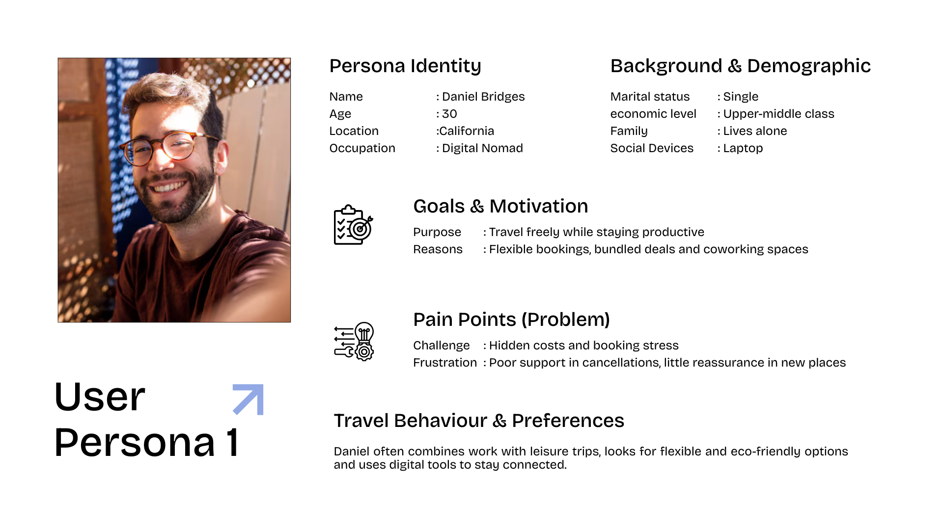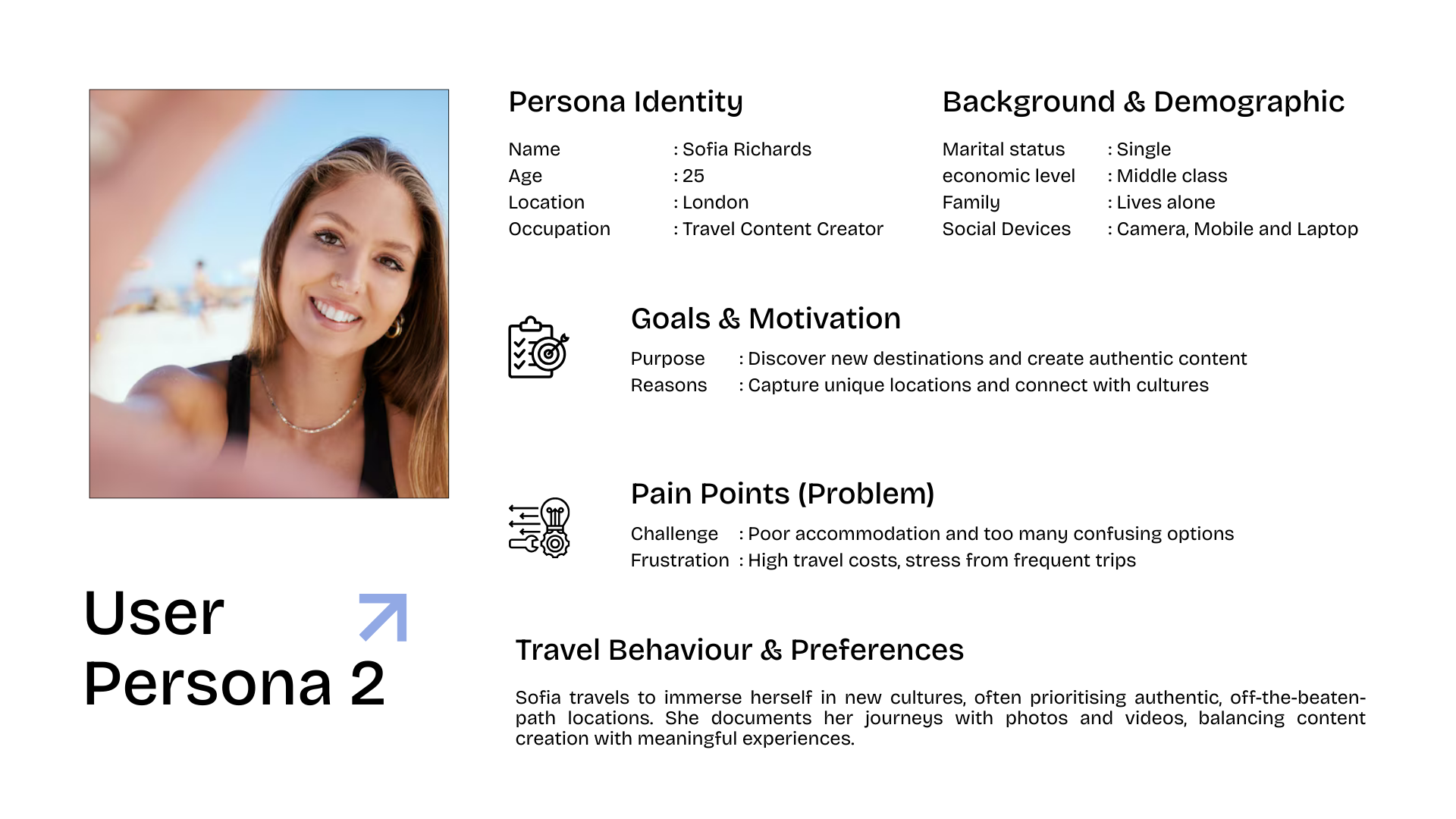 From these insights, I created a set of personas that captured the different types of travellers I was designing for. Each persona highlighted distinct needs, motivations and frustrations, which helped me make design decisions that felt grounded and purposeful.