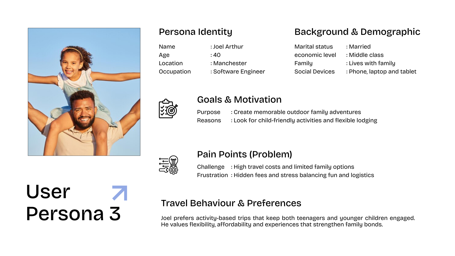 Before sketches, systems and screen layouts. I needed to understand who I was designing for and why. This stage was all about people. Planning a holiday might sound exciting but when you dig into it, the reality often involves messy logistics, tight budgets and competing priorities. My goal was to step into those real experiences and design with empathy.